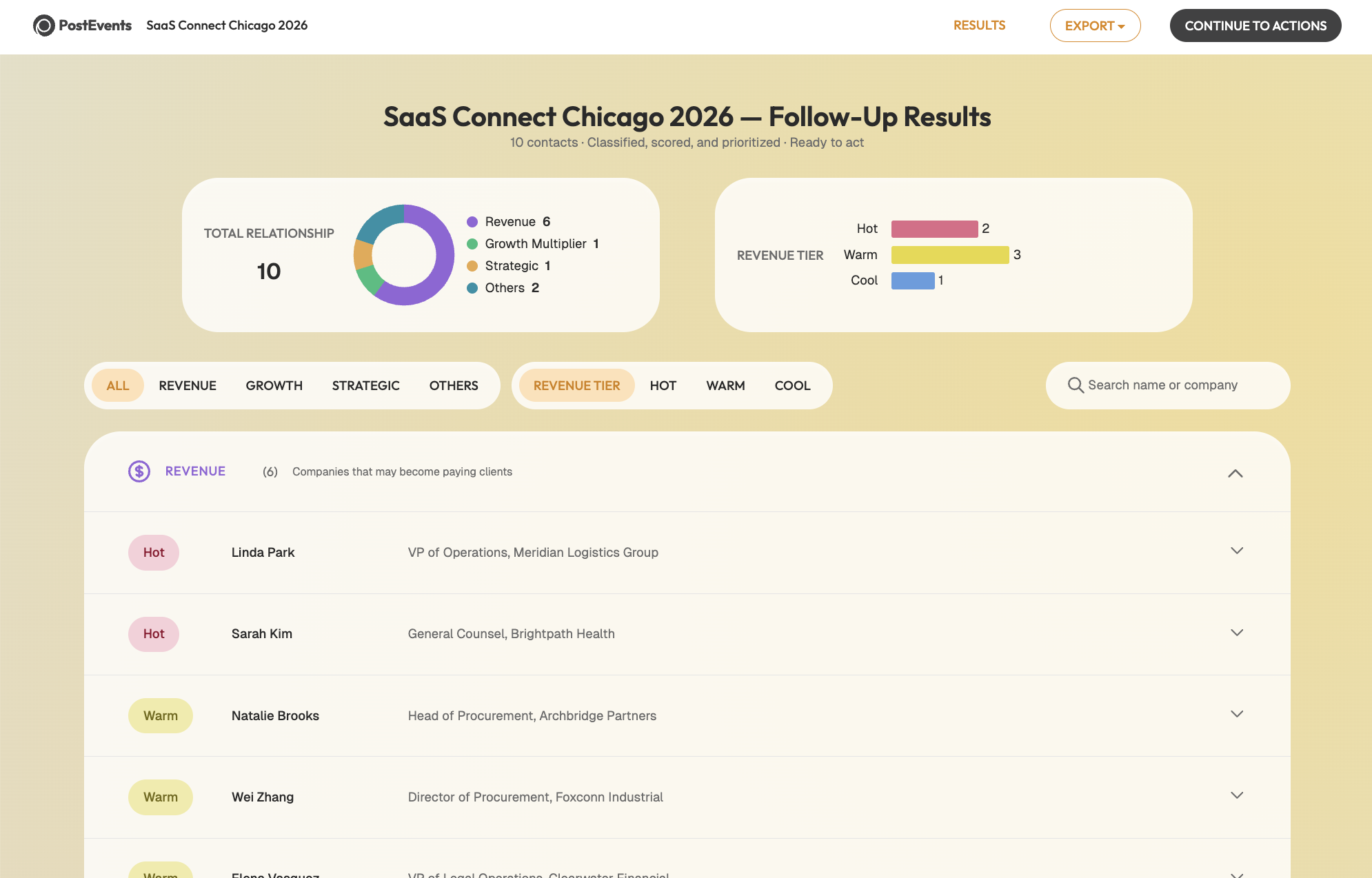 - After Stage 6: A results dashboard shows the full classification output (tier, relationship type, recommended action) before any exports are used.Follow-up Results: A prioritized view of leads with suggested next actions and ICP scoring.