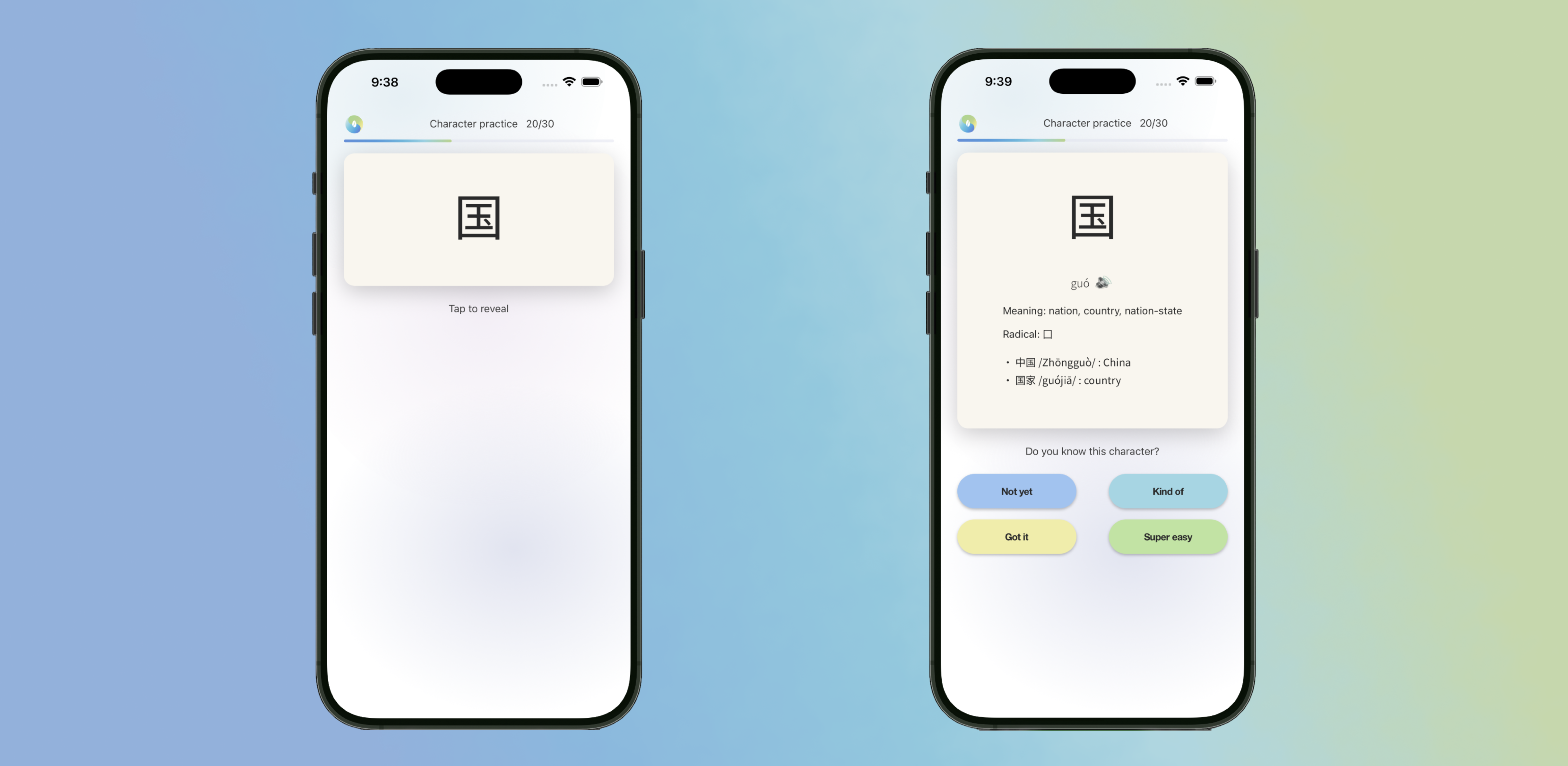 Front: The character appears alone to invite independent recognition. Back: A tap reveals the audio and Pinyin, allowing the learner to engage at their own pace.