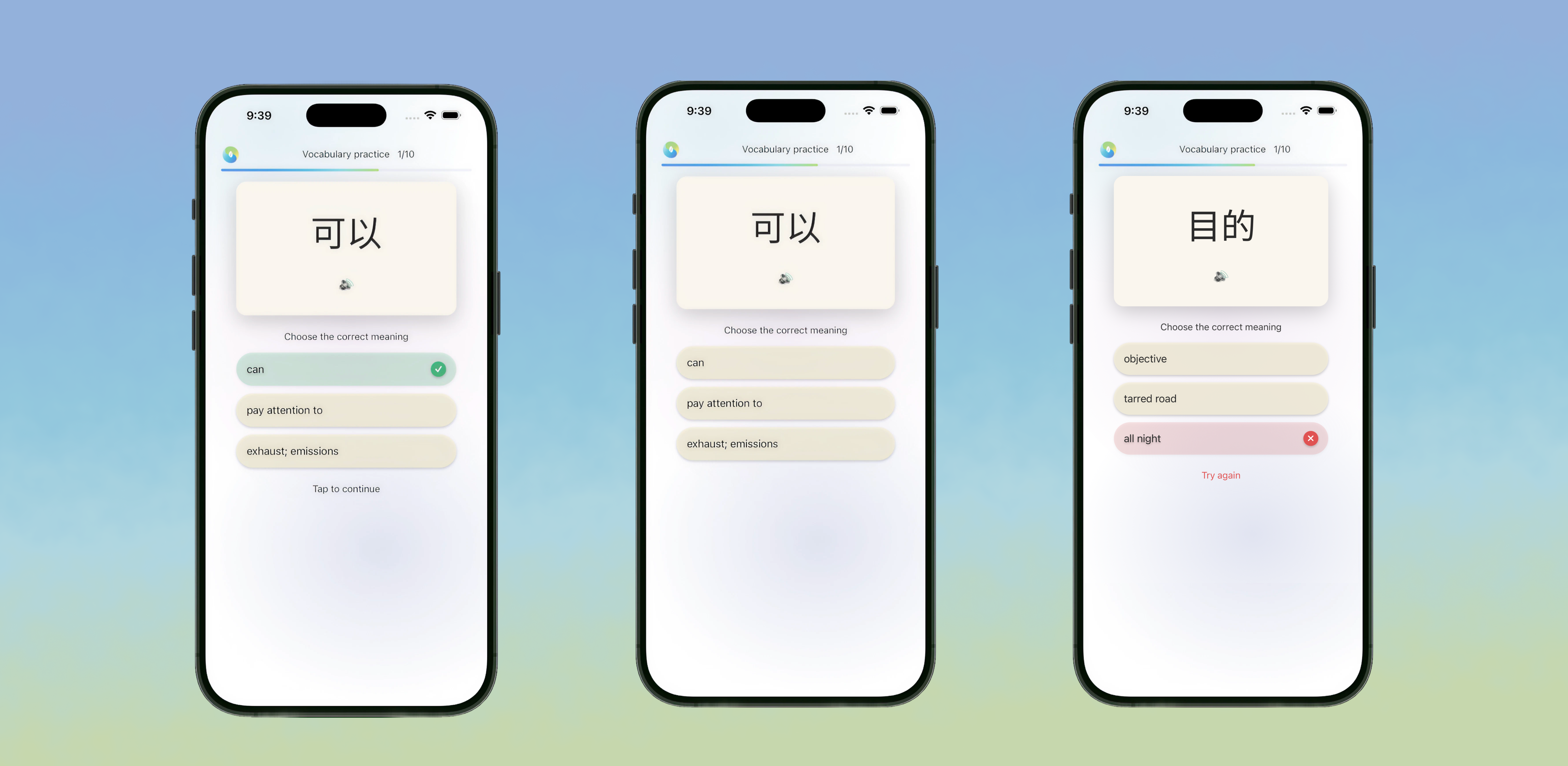 Following the individual character review, vocabulary questions anchor the abstract characters to words the learner already knows from spoken language. Feedback is immediate but gentle. A correct answer receives a soft green confirmation without fanfare, while a wrong answer receives a subtle highlight and a simple prompt to try again. Failure is treated as data, not punishment.