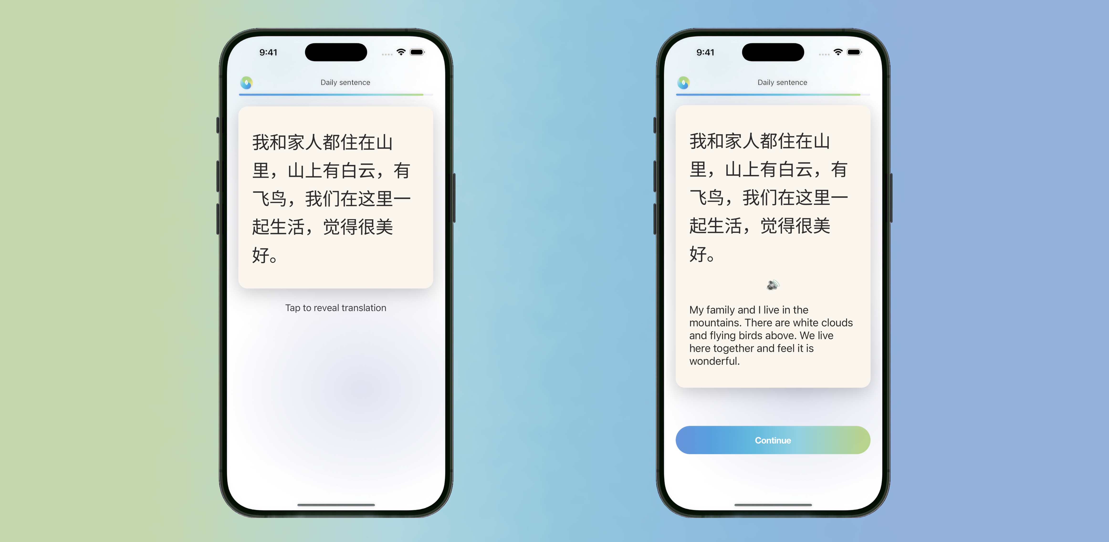 The sentence appears in Chinese first. A tap then reveals the English translation and an audio icon. The emotional function of this step is to reassure the learner that they can actually read real content.