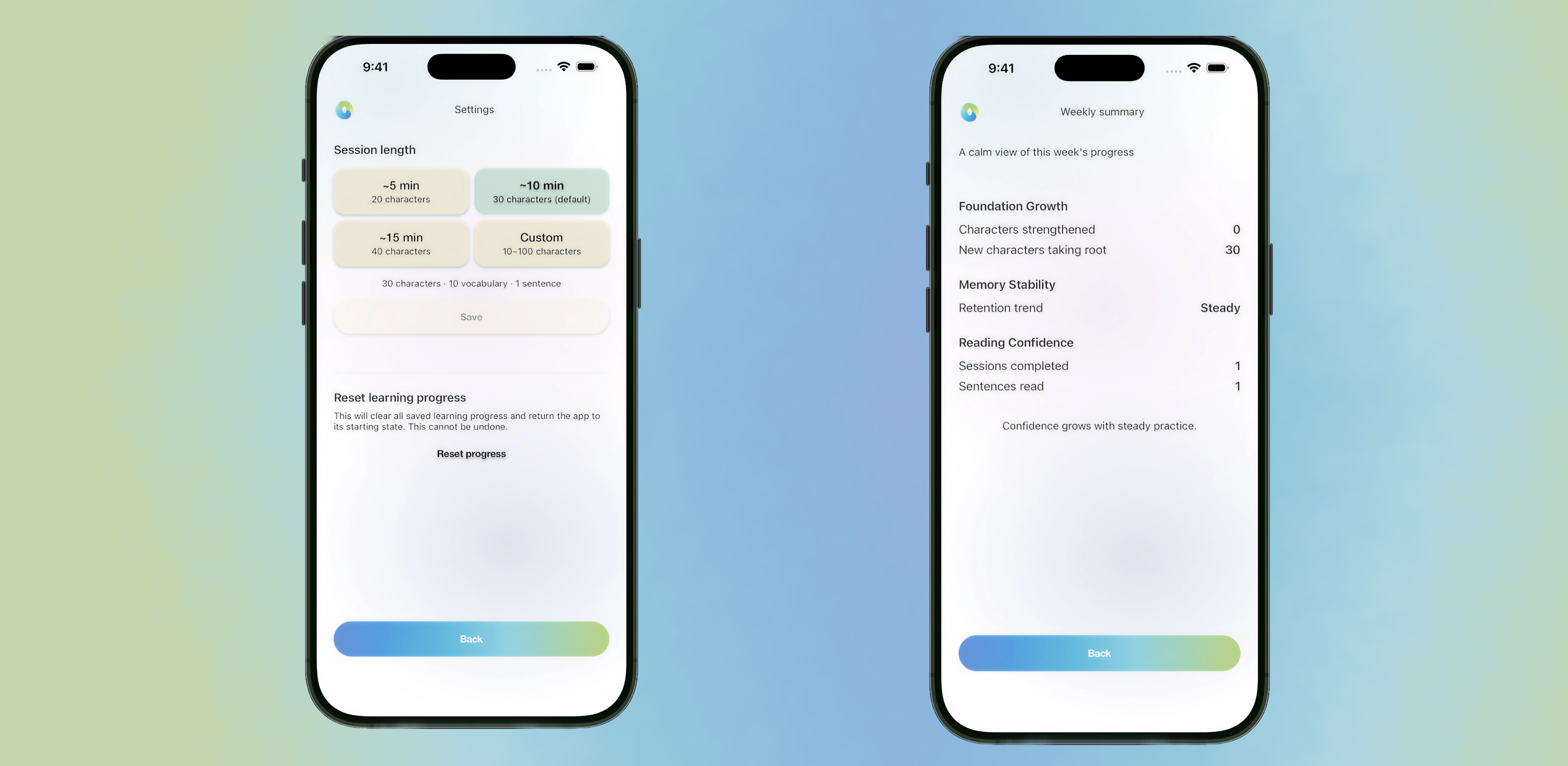 Clarity on progress is essential for both independent and supported learners. Instead of complex dashboards or forgetting curves, I designed the weekly summary to provide reassurance that steady practice is working. Progress is reported in human language: "Foundation Growth," "Memory Stability," and "Reading Confidence" replace abstract metrics.