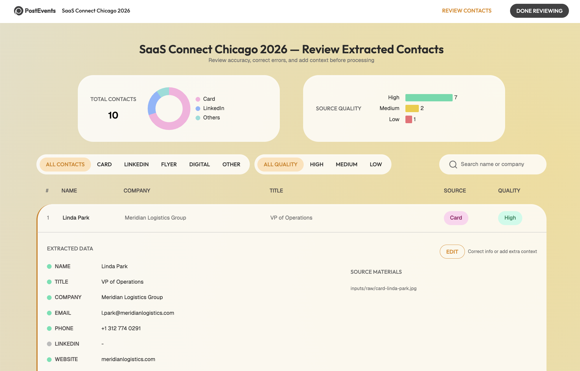 The tools that exist around this problem have not helped much. CRM card scanners read the name but mangle the company. Generic AI assistants require the user to paste in each contact one at a time. Nothing holds the full context of an event: who this person is, why they matter, what the right next action is.